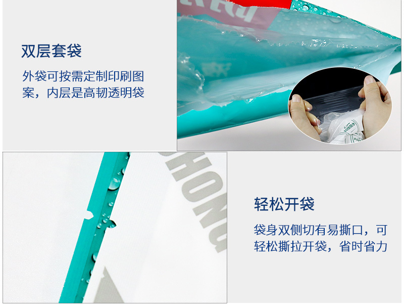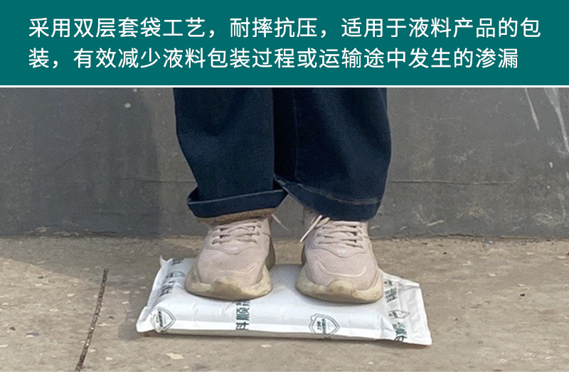 袋中袋使用效果:双层套袋的袋中袋形式,让内容物在运输过程中在碰到外部尖锐的物体时,即使第一层外袋被刺破,但由于两层袋子