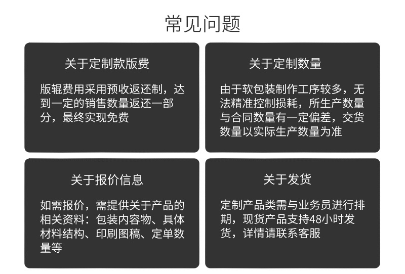 只要用了我们的包装,不管是包装膜的问题还是包装机的问题,都是我们的问题!只要有质量问题,马上召回,不管有多远!